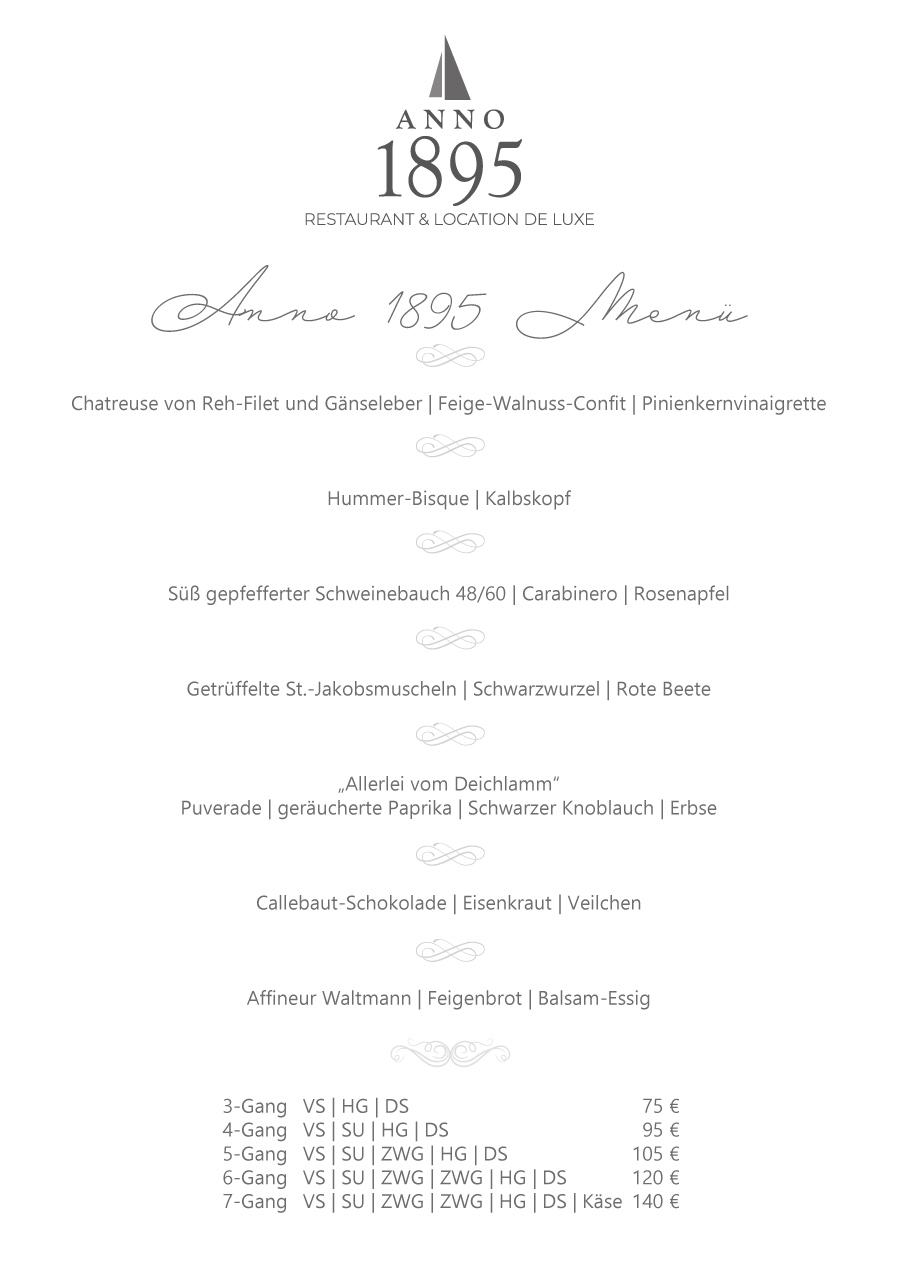 Do., Fr., Sa.: ab 17:00 Uhr | So. auf Anfrage | nur auf Reservierung | 04621 – 53 09 450 – oder info@anno1895.de